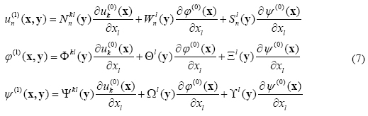 Las aproximaciones enésimas de los campos, presentes en las ecuaciones (4), dependen de los términos n y n+1 del desplazamiento y los potenciales (Otero, 2003). Por lo que para obtener de forma explícita los coeficientes efectivos se propone uk(1)(x,y), φ(1)(x,y) y ψ(1)(x,y) en la forma (7) y se sustituyen en la aproximación de orden cero de los campos.