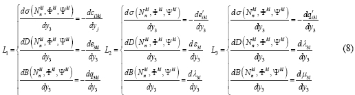 Las funciones ui(1)(x,y), ui(2)(x,y),..., φ(1)(x,y), φ(2)(x,y),..., ψ(1)(x,y), ψ(2)(x,y),... son periódicas en las coordenadas locales. Sustituyendo (3) en las ecuaciones constitutivas (2) estas toman la forma: