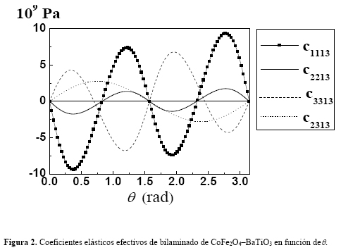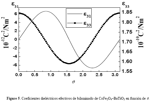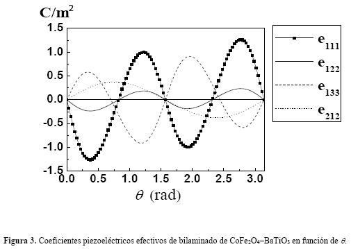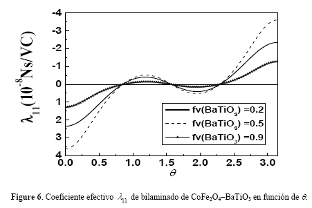Al calcular las propiedades del compuesto para el caso límite (θ = 0), los resultados obtenidos coinciden con los alcanzados por Li y Dunn (1998) y Aboudi (2001), ambos por métodos diferentes. Las figuras 2-6 (3, 4, 5) muestran algunas de las propiedades efectivas obtenidas en función del ángulo entre la magnetización y la polarización, en todas se ha considerado ambas láminas de igual tamaño. Además de los coeficientes obtenidos para el caso límite, que son funciones pares de θ, se obtienen nuevos coeficientes efectivos que son funciones impares de θ. Los datos necesario para los cálculos se han obtenido de (Bravo-Castillero et al., 2008). El eje de simetría de la CoFe2O4 no coincide con ningún eje del sistema xi ,por lo que en este sistema los tensores de las propiedades de la ferrita no van a tener una forma correspondiente con la simetría del material.