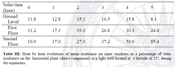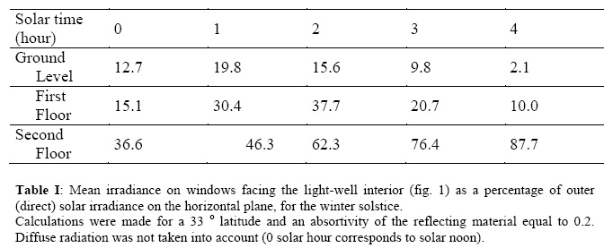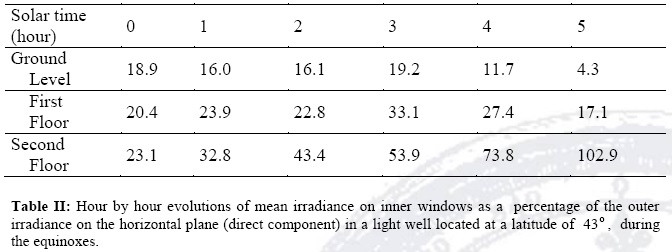 As an example, it can be calculated the mean illuminances onto the windows at the lowest level , for 43 degree latitude, during the equinoxes. Using this latter efficiency figure in combination with Table II irradiances values and the Hottel model [ 9 ], it is found that mean illuminances are over 2200 lux between 4am to 4pm , with a maximum near 11000 lux at solar noon. On the contrary, when the well inner surface is smooth but of a dark color (absortivity around 0.5) , the model predicts that the corresponding illuminances values are much smaller.