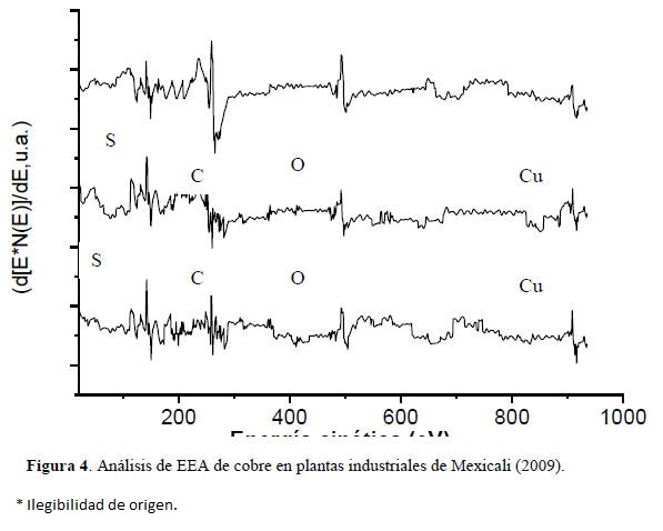 Los análisis de MEB y EEA, se llevaron a cabo para determinar los productos de corrosión formados en la superficie de cobre. La Figura 2 muestra la micrografía de MEB con imágenes de una zona con los principales productos de corrosión y las regiones analizadas por EEA a nanoescala. Esto indica lo antes mencionado con el análisis de MEB de la presencia de Cl y S principalmente, que reaccionan con la superficie de cobre [17]. Los análisis espectrales de Auger de Cu fueron generados usando un haz de electrones 5keV, que muestra un análisis de la composición química de las películas que se forman en su superficie en las Figuras 3 en Ensenada y Figura 4 en Mexicali. Se tienen los espectros de EEA de tres puntos evaluados en diferentes zonas de las probetas metálicas.