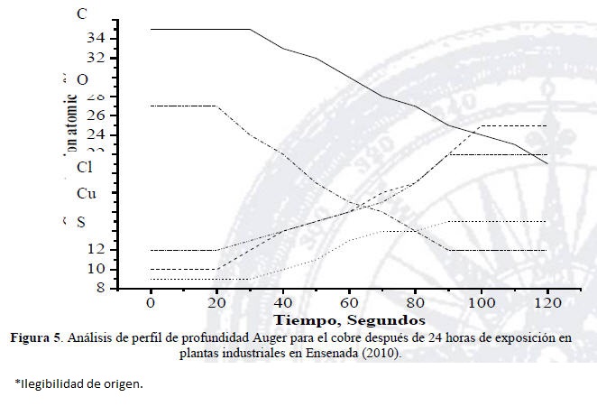 En la figura 3, los espectros indican la presencia de carbono y oxígeno, cloruros y sulfuros, con diferentes niveles de cada elemento químico en las tres regiones analizadas, donde el contaminante principal fue el Cl-. En la figura 3, que corresponde a los modelos instalados en las empresas en la ciudad de Mexicali, analizados también en tres regiones de la superficie de cobre, se observaron los diferentes niveles de azufre, carbono y oxígeno, siendo el contaminante atmosférico principal el H2S. La concentración atómica (%) de los elementos químicos en cada espectro se organizó en la tabla 5. La resolución espacial de esta técnica es de alrededor de 100 nm y una resolución de 1 nm de profundidad. Los análisis de perfiles de profundidad, se realizaron para determinar la formación de las películas en la superficie de Cu, mostradas en las Figura 5 en Ensenada y Figura 6 en Mexicali. La técnica de perfiles de profundidad se define por la alternancia de ciclos de Ar +-ion erosionando para remover una capa delgada (de 5 a 10 Ǻ) de los contaminantes del aire que reaccionan con la superficie de cobre y su caracterización en algunas regiones con la técnica de EEA. El análisis de ambas ciudades, indican la manera de analizar la manera de reducir la concentración de carbono y oxígeno y el incremento de Cl, S y Cu en Ensenada y S y Cu en Mexicali, bombardeando las muestras durante el primer ciclo de pulverización.