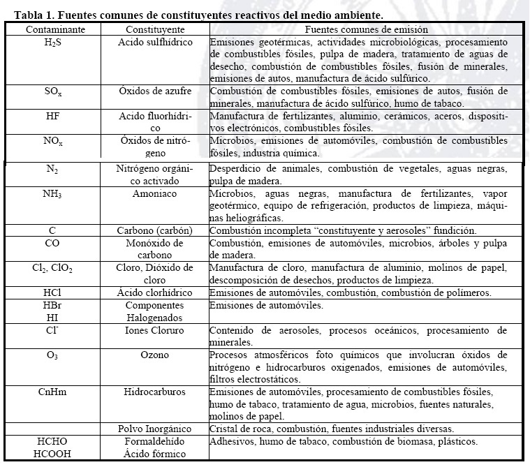 Las actividades de transporte, almacenamiento, operación de los dispositivos y equipos electrónicos en interiores de plantas industriales, están sujetas a diversos tipos de ambientes con contaminantes del aire y variaciones de clima que generan corrosión y se clasifican de acuerdo a las condiciones ambientales. Existen normas que apoyan a proteger a los equipos electrónicos, como la European Telecommunications Standard (ETS) [10], aplicada a los análisis de ambientes a los que se exponen los sistemas de telecomunicaciones, así como otras normas que a continuación se especifican: IEC 654-4 [11] y la ISA S71.04 [12]. El proceso de corrosión en interiores de plantas industriales implica la deposición de partículas en superficies metálicas. Dichas partículas atmosféricas finitas de 0.2 mm de diámetro, generadas naturalmente de rocas y suelos, no son corrosivas pero sí abrasivas y originan una alta resistencia en contactos o conectores eléctricos. Estas partículas finas son difíciles de eliminar y se introducen por filtros de aire acondicionado, orificios o rendijas. Los iones más comunes de estas partículas generados en los interiores son el NH4+ y SO42-. Otro factor importante es la disminución de los niveles oxidantes atmosféricos en interiores como el O3, CO, NOX y SO2 provenientes del exterior, además de ciertos contaminantes del aire como el H2O2, NO2, HNO3 y otros que se mencionan en la tabla 1, generados en interiores de empresas. Además se incluyen las diferentes velocidades de aire en interiores de plantas industriales que determinan las variaciones de humedad y temperatura y la velocidad de deposición de estos contaminantes en las superficies metálicas.