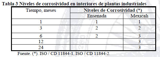 Los valores de HR y temperatura superiores a 70% y 35 º C durante el año en Mexicali y con un mínimo de 20% y 30 º C y un máximo de 80% y 10 º C en Ensenada, son factores principales para la generación de corrosión en ambas ciudades, que indican los niveles de corrosividad en interiores de plantas industriales (Tabla 3).