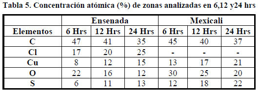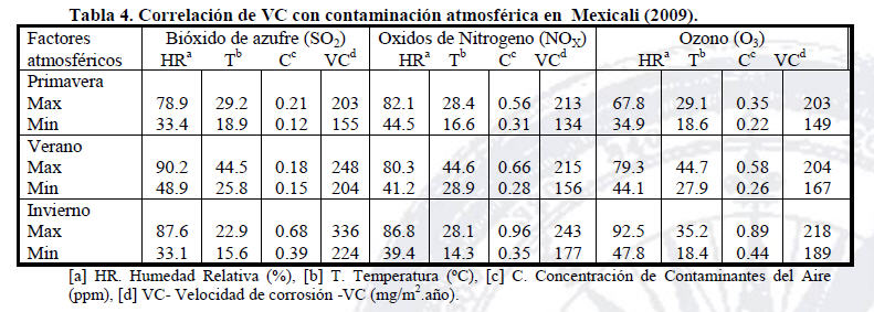 Los altos niveles de humedad y temperatura incrementan la VC, presentando una mayor presencia de corrosión después de los seis meses en Mexicali, por lo cual se realizó la evaluación durante seis meses en Ensenada. En ambas ciudades en el rango de 25 º C a 35 º C, con humedad relativa al 30% a 70%, la VC se incrementa muy rápido. Además, en invierno, a temperaturas de alrededor de 15 º C a 25 º C y HR de 35% al 75%, se origina la condensación del agua y con ello la formación de una película delgada húmeda en la superficie metálica del cobre y la VC aumenta muy rápido. Las variaciones de la HR en el rango de 30% a 80% y una temperatura de 0 º C y 35 º C, aunado a las concentraciones de contaminantes atmosféricos que sobrepasan los niveles estándares de calidad del aire según la EPA-US, tienen un efecto mayor en la VC, siendo los sulfuros en esta zona árida y cloruros en este ambiente marino, los agentes que promueven con mayor rapidez la corrosión. En Mexicali, a temperaturas superiores a 35 º C con HR del 50% y 85%, la VC fue lenta y en Ensenada este proceso observó con rangos de temperatura de aproximadamente 32 º C y HR del 30%. La tabla 4 representa el efecto de la exposición de cobre a los contaminantes atmosféricos como el SO2, NOX y O3, HR y temperatura, concentración de contaminantes del aire y VC del cobre en Mexicali.