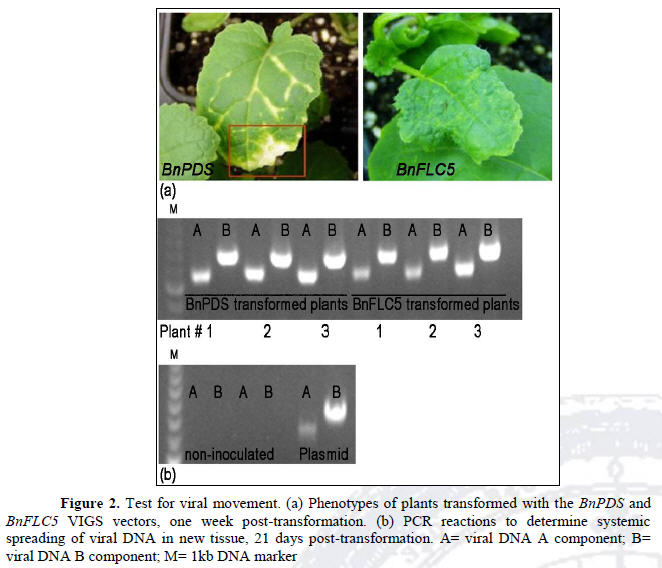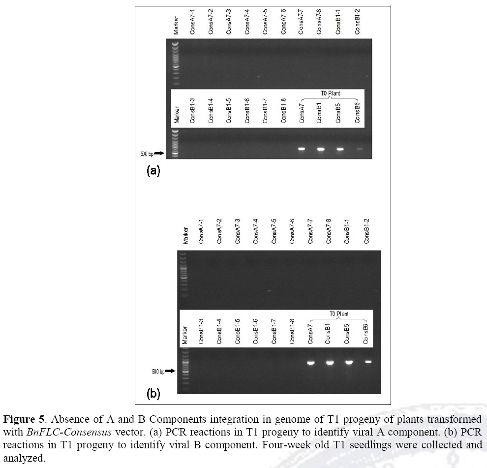 After biolistic transformation, and in order to determine the presence and dispersion of viral DNA A and B components, the following PCR primers were designed to test for viral movement: CLCV-BGenF: 5'-ggatctaccacgatatctaataggc-3'; CLCV-BGenR: 5'-acagagttagcgacacaaatgtg-3'; CLCV-AGenF: 5'-aataaagacgacgtctaccacaac-3'; CLCV-AGenR: 5'-tcttgtgctgtgctttgatagag-3'. The CLCV-BGenF and CLCV-BGenR primers target the B component, from the BV1 gene to the BC1 gene. That is, they span both genes. The CLCV-AGenF and CLCV-AGenR primers target the A component, from the AC4 gene to the AC3 gene. They span both genes. Also, in order to determine BnFLC gene down-regulation after plant transformation, the following primers were used: BnFLC1F 5'-gccagatggagaagagtaatctt-3; BnFLC1R 5-gagccggagagagagtatagattat-3 BnFLC2F 5'-ctagccagatggagaagaataatc-3'; BnFLC2R 5'-gatatacaacgttcacccttatagg-3'; BnFLC3F 5'-gctgaaagaagagaatcaggc-3'; BnFLC3R 5'-ctcagccaagggagtattgag-3'; BnFLC4F 5'-ctagccagatggagaagaataatc-3'; BnFLC4R 5'-aagagagtgtgaagatatacaacgc-3'; BnFLC5F 5'-ccgaagctgataatatagagatgtc-3'; BnFLC5R 5'-gggttaaactgacataggttatttg-3'; PDSF 5'-gatataccaaggccagagctaga-3'; PDSR 5'-tcccaagttctccaaataagttc. The conditions for PCR were as follow: an initial cycle at 95oC for 5', followed by 32 cycles for 30 seconds at 95oC, 30 seconds at 58°C, 40 seconds at 72°C, and a final cycle of 5' at 72°C. Both, leaves and floral buds were assayed.