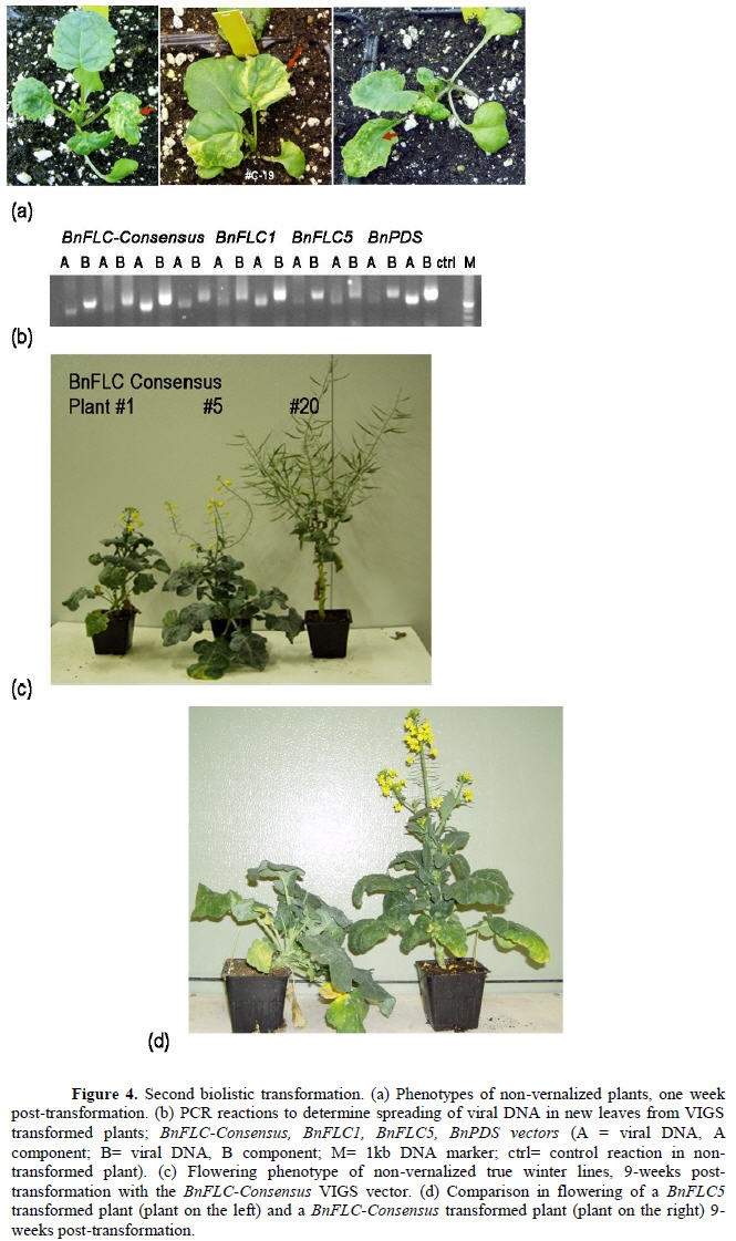 Several approaches have been employed to achieve gene silencing in Brassica spp., but none using VIGS vectors. Here, with the use of biolistics and VIGS technology, we developed a silencing system in Brassica to determine gene function and to induce flowering without vernalization in winter Brassica lines. Canola seeds were surface sterilized and germinated on solid B5+GA media-containing plates in long day conditions (16 hours of light at 22°C and 8 hours darkness at 18°C). In a first biolistic transformation experiment, independent mixtures consisting of the Cabbage Leaf Curl Virus-B vector (viral DNA genome B component, CaLCuV-B) and each one of the rest of the VIGS constructs (viral DNA genome A component, CaLCuV-A) containing the different BnFLC genes (CaLCuV-A+FLC1, CaLCuV-A+FLC2, CaLCuV-A+FLC3, CaLCuV-A+FLC4, CaLCuV-A+FLC5), a consensus BnFLC sequence (CaLCuV-A+FLC-Consensus), and the PDS gene as control (CaLCuV-A+PDS), were used to transform 17-days old seedlings. Initially, 12 seedlings were transformed with each vector combination (seven combinations overall; 84 plants overall). Following transformation, the plants were maintained for 10 days on Petri dishes in long day conditions and then transferred to soil. After one week in soil, plants transformed with the control PDS containing-vector (CaLCuV-A+PDS) started to develop a visible phenotype. That is, forty percent of the PDS transformed plants developed yellow and/or chlorotic areas indicating PDS down-regulation (see Turnage et al., 2002).