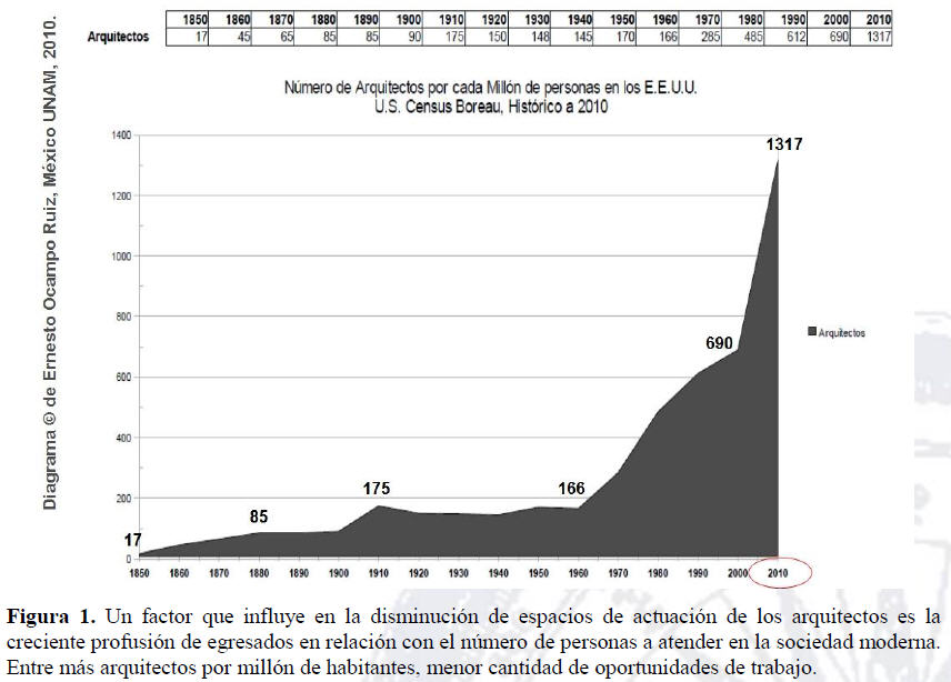 Todas las causas mencionadas, se ven intensificadas ante un fenómeno que es preocupante: la profusión de arquitectos a nivel mundial. En Estados Unidos de América se ha llevado un correcto y detallado cálculo de crecimiento de la población de arquitectos. Mientras en 1850, existían 17 arquitectos por millón de habitantes, durante la mayor parte del Siglo XX la relación fue de 165 arquitectos por millón de habitantes8. Al finalizar la década de los años 70's, y como consecuencia de la educación masificada mundial, se generó una explosión demográfica que llevó a alcanzar el número de 690 arquitectos en el año 2000, y a 1317 arquitectos en 20109. Esta profusión aumenta literalmente la competencia entre los arquitectos, reduce los proyectos arquitectónicos posibles y disponibles per cápita, reduce las oportunidades laborales en las dos actividades tradicionales, el diseño arquitectónico y la construcción, además de que genera en momentos de alerta económica y financiera mayor desempleo y subempleo.