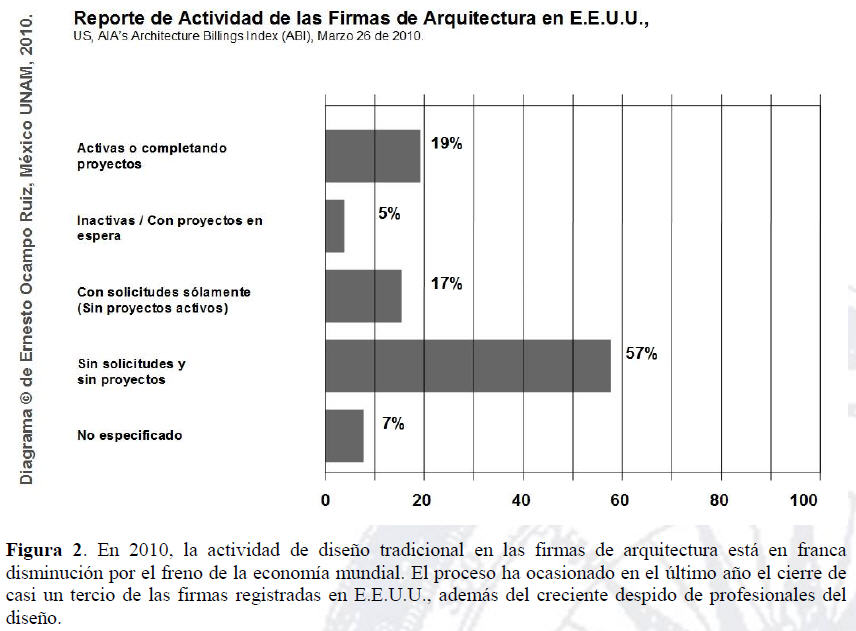 En los Estados Unidos de América, durante 2009 la tendencia fue similar ya que los arquitectos mostraron el mayor incremento en desempleo frente a todas las profesiones registradas (Lubell, 2009). El American Institute of Architects (AIA), a través del Architecture Billings Index (ABI), ofreció además el comportamiento de las actividades de las firmas de diseño arquitectónico, declarando que hoy la actividad del diseño de todas las firmas de arquitectura está en descenso, debido entre otras cosas a la falta de recursos financieros. En marzo 26 de 2010 (Baker, 2010), el 57% de las firmas de arquitectura reporta no tener solicitudes de nuevos proyectos y estar sin proyectos en proceso, mientras que el 19% de las mismas se encuentra terminando proyectos en proceso y sin tener más solicitudes en puerta. Esto permite apreciar que en lo que resta de 2010, con 76% de las firmas de arquitectura sin actividad de diseño, será dificil que el comportamiento se invierta, además de que si en este momento no se desarrollan proyectos arquitectónicos, es poco probable que la actividad de construcción se reactive en breve.