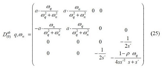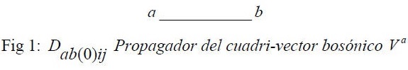 donde D(0)αb(i,j) es una matriz hermitiana no singular 4x4 que representa el propagador del campo cuadri-vector Vα. En el espacio de Fourier (q ωn), donde q y ωn son respectivamente el momento y la frecuencia de Matsubara del campo bosónico, asociamos a este propagador libre el siguiente diagrama (de línea continua) conectando los puntos genéricos α y b: