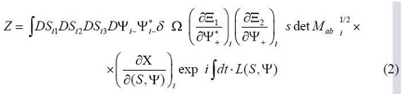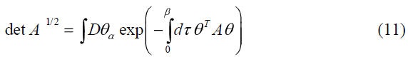 en la integral de camino (2), evaluado sobre los vínculos, puede ser reescrito como el s detMab de una supermatriz 6x6 asociada a tres variables de campos bosónicos Si a un vínculos bosónico Ω y a dos campos fermiónicos independientes Ψ*- y Ψ-.