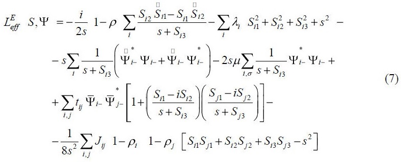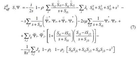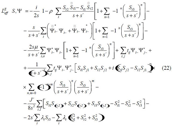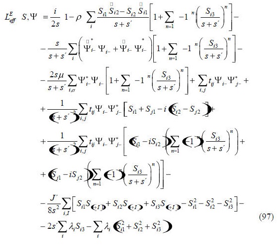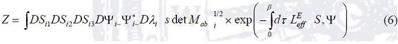 Teniendo en cuanta los resultados anteriores es inmediato obtener la expresión explícitas del Lagrangiano total (14). El LEeƒƒ se obtiene partir de la ecuación (6) para Z, exponenciando el superdeterminante de Mαb y desarrollando el campo S en función de las fluctuaciones (9), así tenemos: