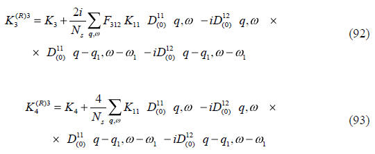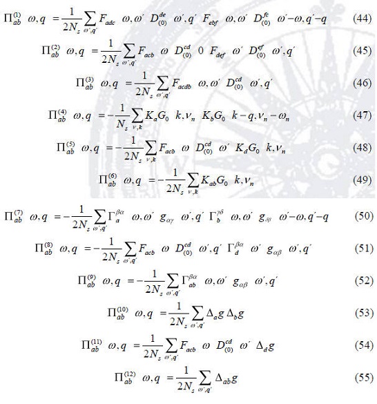 Es posible mostrar que los infinitos de las seis primeras contribuciones (44-49) originadas por la suma sobre las frecuencias de Matsubara ω' son canceladas con los infinitos que aparecen en las segundas seis contribuciones (50-55), así se puede obtener una expresión renormalizada de la auto-energía bosónica