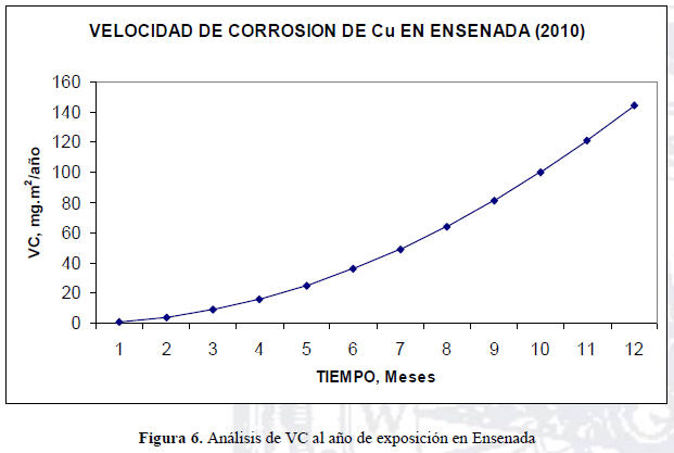 El mecanismo del proceso de formación de películas en forma de depósitos cubiertos por óxidos en la superficie de Cu, se desarrolló en base a diversos factores como los niveles de humedad y temperatura que proporcionan el tiempo de humectación (TH). El TH es muy importante porque permite conocer si una superficie metálica se cubre totalmente de óxidos, para servir como películas protectoras que inhiben o disminuyen el fenómeno de corrosión, o solo permitir el mojado de ciertas zonas del metal, lo que promueve e incrementa la VC. En este estudio se desarrollaron los análisis de la perdida de peso, en relación a los periodos de exposición de las probetas metálicas en cada ciudad evaluada. Las Figuras 6 y 7 muestran los dos tipos de comportamiento lineal y parabólico, indicando si el óxido es poroso y poco protector, si se rompe fácilmente la película o si es protector, lo cual representara que la VC disminuya. La Figura 6, representa una curva parabólica del análisis en Ensenada, mostrando que se forma la película protectora porque el transporte de iones a través del óxido es lento. En cambio en la ciudad de Mexicali, la Figura 7 muestra un transporte de iones en el óxido mas rápido, con un gráfico casi lineal, e indicando que la película tendera a formarse porosa y no cubrirá totalmente la superficie de Cu, incrementando la VC.