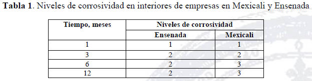 La VC en las zonas desérticas (Mexicali), son mayores que en los ambientes marinos (Ensenada). Un análisis comparativo en los cuatro periodos mencionados, representa una mayor intensidad de la corrosión uniforme en Ensenada y localizada con picaduras y hendiduras en Mexicali. Esto indica que los NC en la industria electrónica de las zonas áridas son más altos que en las zonas marinas. Los NC en Mexicali y Ensenada después en los cuatros periodos analizados se presentan en la Tabla 1, según la norma ISO / CD11844 ((ISO 11844, 2005, ISO 11844, 2006).