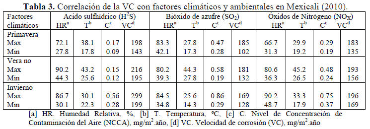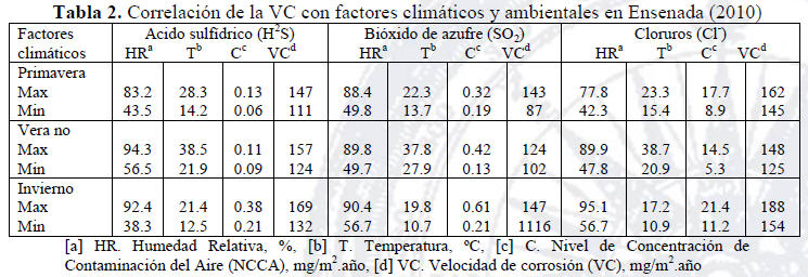 Los valores de HR y temperatura en Mexicali fueron superiores al 70% y 45 ºC en verano y con un mínimo de 20% y 5 ºC en invierno, con vientos del desierto cálido (invierno y primavera). En cambio en Ensenada se presentaron índices máximos de HR y temperatura de 90% y 35 ºC en verano y mínimos de 30% y 5 ºC en invierno. Los altos niveles de HR aceleraron la VC en la corrosión por picaduras. En verano en ambas ciudades, en los primeros seis meses de exposición, la VC no tuvo un incremento considerable, pero a partir de ese periodo, se observó un aumento de este parámetro. En ambas ciudades en el rango de 25 a 35ºC, con un nivel de HR de 30% a 70%, la VC fue la más alta. Además, en invierno, a temperaturas de alrededor de 15 º C a 25 º C y la HR es del 35% al 75%, el agua se condensó en la superficie del cobre y la VC aumentó muy rápido, generando películas húmedas, en cambio cuando la temperatura fueron mayores a 35 º C, y se generaron algunas zonas húmedas y observaron manchas que posteriormente se originaron hendiduras o picaduras. Otro factor importante fueron las concentraciones de los contaminantes del aire, como sulfuros en ambas ciudades, que superaron los niveles permitidos de las normas de calidad del aire, y con las variaciones de HR y temperatura descritas en el rango de 30% a 80% y de 0 ºC y 35 ºC, se originó la corrosión. En Mexicali, a temperaturas superiores a 35 ºC con niveles de HR del 50% al 85%, se formaron manchas en diversas zonas del Cu, y no se generó una película que cubriera todo el Cu y sirviera de protección, como en los casos en la ciudad de Ensenada. Por lo tanto, la VC fue mucho mayor, afectando la conductividad eléctrica del Cu en las conexiones y conectores eléctricos de equipos electrónicos (López G. y col., 2010). En Ensenada este fenómeno no se observó, porque sí se cubrió la superficie de Cu en su totalidad, con rangos de temperatura de alrededor de 25 º C y niveles de HR mayores al 85%. En las tablas 2 y 3 se muestran el efecto de la exposición del cobre a los contaminantes atmosféricos: H2S, NOx, SO2 para Mexicali y H2S, SO2 y Cl- para Ensenada, niveles de HR y temperatura, concentración de la contaminación y la VC. Para Ensenada el valor más alto de VC fue de 188 mg/m2.año, con valores de HR 95.1%, temperatura de 17.2 º C y niveles de concentración de cloruros de 21.4 mg/m2.año. Para la ciudad de Mexicali, el valor más alto de VC fue de 299 mg/m2.año, en valores de HR 86.7%, temperatura de 30.1 º C y niveles de concentración de 0.56 ppm de H2S.