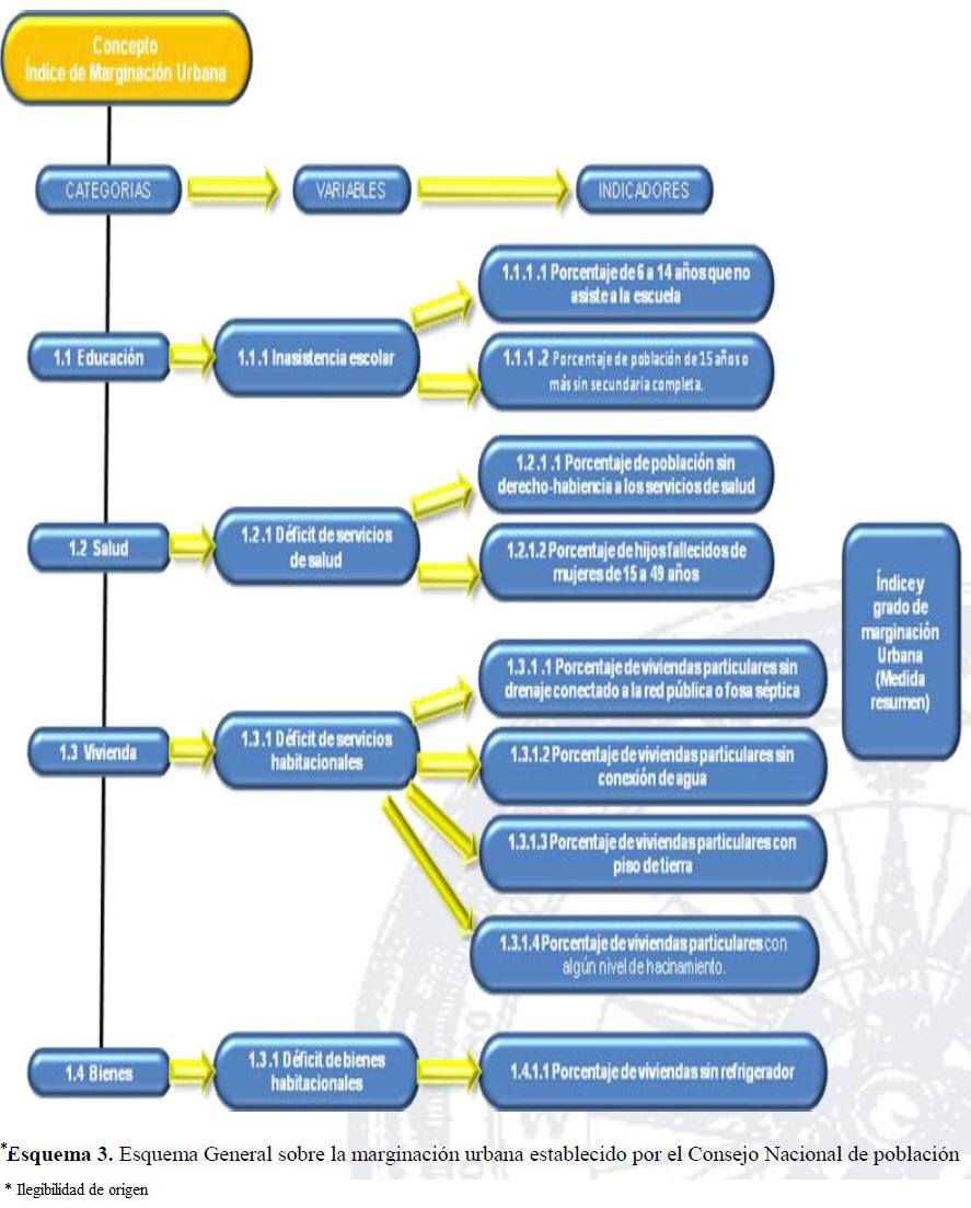 El concepto de marginación empleado por el Consejo Nacional de Población CONAPO, tiene como función primordial la ubicación y definición de conglomerados humanos ubicados en un espacio geográfico, los cuales cuentan con determinadas características socio demográficas, que aplicando la metodología para calcular la marginación da como resultado el índice numérico (cuantitativo) y el grado (cualitativo) de la marginación de la población urbana.