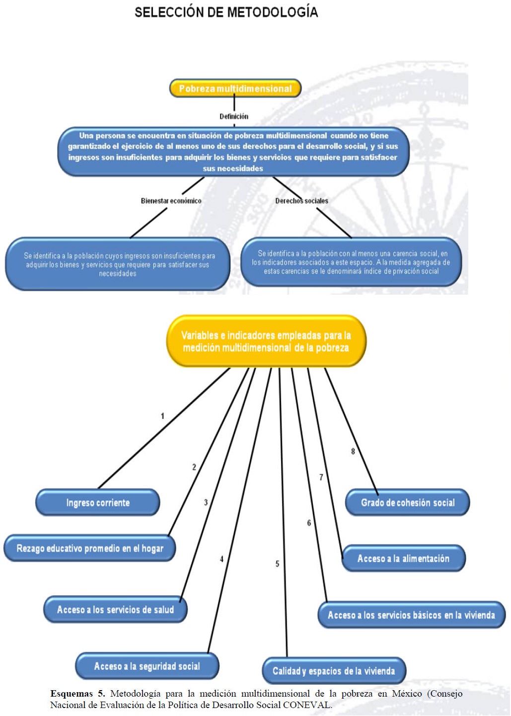 El estudio titulado "Medición de la Pobreza" es un documento básico que establece y cuantifica los tres niveles de pobreza que puede padecer la población en nuestro país, estados y municipios. Así la pobreza de patrimonio, de capacidades y alimentaria son las tres formas de pobreza que caracteriza el documento, las cuales son observadas y cuantificadas a nivel nacional por la CONEVAL y que han contribuido a la definición de polígonos de pobreza a nivel federal (ver figura 1) y a nivel municipal (ver figura 2); mientras que a nivel Estatal la delimitación de áreas de pobreza se ha definido por los datos del ingreso económico (ver figura 3).