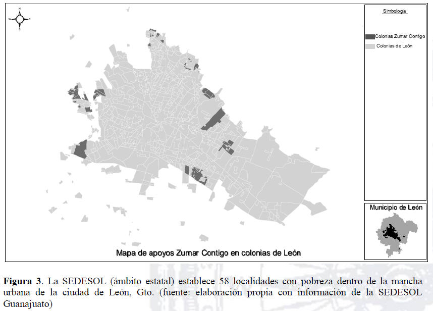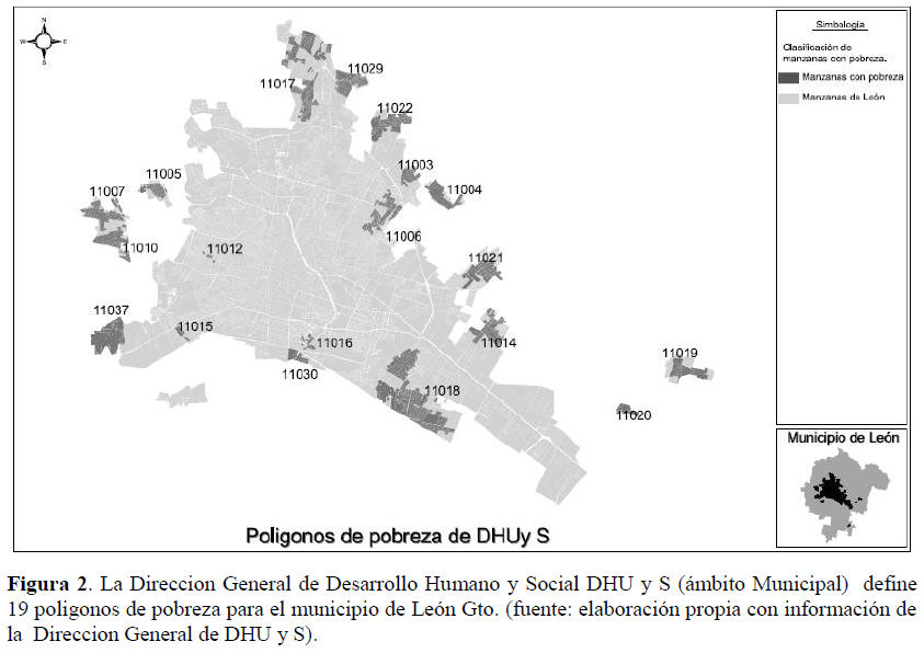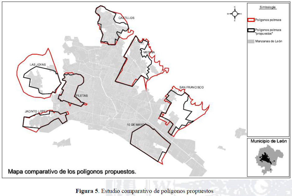En la ciudad de León, desde el año 2002, el Instituto Municipal de Planeación maneja siete grandes polígonos de pobreza (Los Castillos, Diez de Mayo, Jacinto López, Las Joyas, Medina, Piletas y San Francisco), los cuales se definieron tomando como base la información que generó SEDESOL sobre las manzanas donde se concentraba la pobreza. IMPLAN delimitó siete áreas mayores en la perspectiva de realizar siete planes de desarrollo parcial en las zonas referidas (ver figura 4).