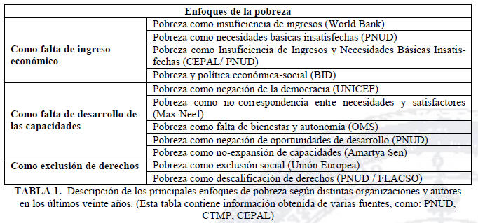 El concepto de pobreza debe incluir componentes absolutos y relativos, correspondiendo los primeros al cumplimiento de las condiciones de sobrevivencia, de manera independiente al tipo de organización y grado de desarrollo de la sociedad, y los segundos a las comparaciones interpersonales de bienestar. A diferencia de las anteriores estas últimas sí responden a referentes definidos en el tiempo y en el espacio, expresadas a través de los satisfactores. En las últimas dos décadas los distintos enfoques de pobreza utilizados por distintas instancias se pueden sintetizar en tres enfoques principales: como falta de ingreso económico, como falta de desarrollo de las capacidades y como exclusión social. (ver tabla 1).
