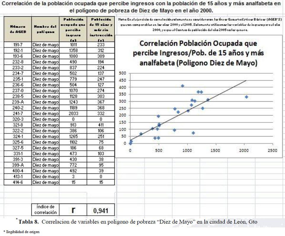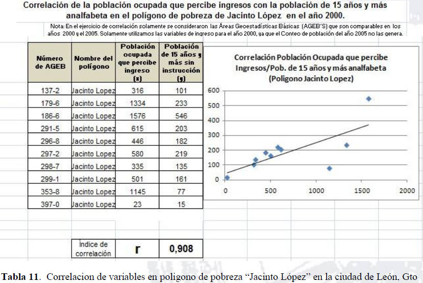 Otro de los criterios que se propone tomar en cuenta para actualizar el status de los polígonos de pobreza, es tomar en cuenta la correlación de las variables existentes de la información del año 2000 y 2005; al realizar el ejercicio los resultados nos mostraron una alta correlación entre grado de escolaridad y el ingreso de la población.