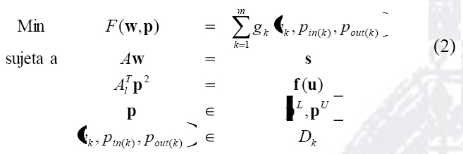 Supongamos ahora que el vector fuente s satisface la condición (1), y que las cotas de presión inferior pL y superior pU están dadas en cada nodo. El problema consiste en determinar al vector de presiones p y al vector de flujos w de tal forma que se minimice el consumo total de combustible, esto es,