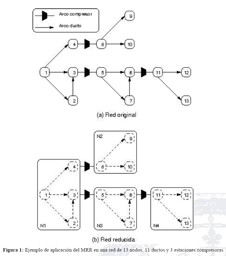 La Figura 1 muestra en ejemplo de aplicar el MRR en una red de 13 nodos, 11 ductos y 3 estaciones compresoras. Como puede apreciarse en la parte (b), la red reducida tiene 4 nodos y 3 arcos.