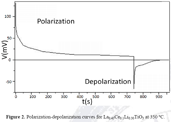 Figure 2 shows the polarization-depolarization curves (potential V vs time t) obtained from EPSS technique at 350 °C. A polarization pulse was applied to the sample, and at 750 seconds the voltage was removed. The material is initially strongly polarized and the voltage curve slowly diminishes to a fixed value that represents the residual polarity. This residual polarity is indicative of lithium ions blocked at the platinum electrodes, indicating lithium conduction in the material. Removing the initial pulse a similar curve is obtained, but not residual polarization is observed.
