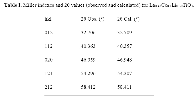 The cell parameters calculated from the diffraction data are a = 3.8690(4) Å; b = 3.8706(5) Å and c = 7.746(2) Å. This values are lower than the reported values for orthorhombic La0.57Li0.27TiO3 (a = 3.8801(3) Å, b = 3.8723(3) Å and c = 7.7747(6) Å) (Inaguma 1997, 105). The apparent smaller unit cell size for the Ce(IV) doped LLTO compared to the doped one is in agreement with the expected effect caused by the replacement for La(III) by the smaller cation Ce(IV). Note that the obtained cell volume (V = 115.9 Å3) is in the order to the obtained for La0.45Ce0.1Li0.27TiO3 (V = 115.2 Å3) (Fernández 2012, 59), despites the differences in composition.