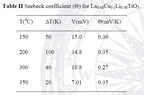 Table II shows the experimental values of Seebeck coefficient (Θ) for La0.43Ce0.1Li0.30TiO3 at different temperatures (T) and temperatures gradients (ΔT).