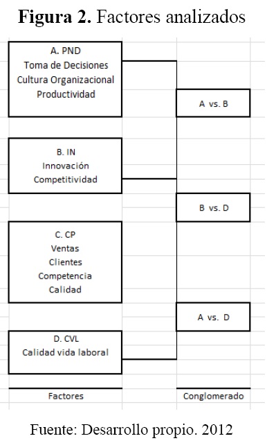 Para facilitar el análisis de datos hemos dividido los reactivos del instrumento en factores, que de acuerdo a Hernandez, Fernandez y Baptista (2010,260) es una combinación lineal de las variables originales. Para este estudio hemos tomado cuatro factores, que agrupan las distintas variables y categorías a analizar, los resultados obtenidos del instrumento: a) planeación y nivel de dirección (PND): donde se agrupan todas las preguntas concernientes a cultura organizacional, productividad y toma de decisiones; b) innovación (IN): agrupa las preguntas claves sobre competitividad y procesos de innovación en la empresa; c) capacidad productiva (CP): incluye aspectos de ventas, clientes, competencia y calidad de sus productos; y d) calidad de vida laboral (CVL): abarca las preguntas sobre este tema en la quinta parte del instrumento.