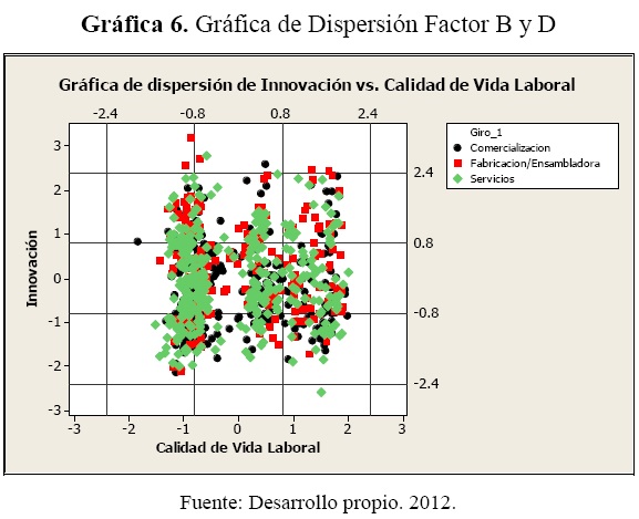 La gráfica 5 muestra los Factores de PND versus CVL con base en el giro de cada empresa. Con dos conglomerados muy marcados al igual que la gráfica dos. Las empresas, en sus tres giros, que tienen una CVL medio bajo, tienden a tener una PND desde medio bajo hasta medio alto, y por otro lado, las empresa que tienen una CVL de medio a medio alto, la tendencia es que tengan una PND de media a media alta. Para este caso, a mayor y mejor el ambiente humano en donde los empleados realizan su trabajo, la CVL incrementará (Davis & Newstrom, 2003, 7). Esto va a tener una influencia en la cultura organizacional y su proceso de toma de decisiones, para determinar un curso de acción para resolver determinado problema, como variables directas para que se den buenas condiciones en la CVL en sus empleados (Stoner, Freeman & Gilbert, 1996).
