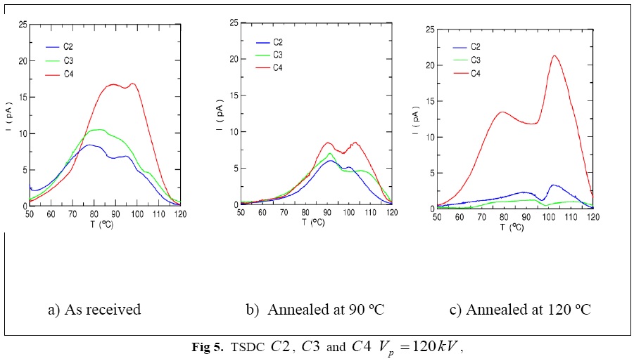 We initially detected more charge by means of the techniques PEA and TSDC, but the heat treatment improved the behavior with regard to the cables C 2 and C 4. This may be due to the fact that the cable C3 contains a resin commercial basis (LDPE-2) different from C2 and C 4. The influence of temperature can cause a higher degree of cross-linking and the elimination of by-products of the reaction of reticulated.