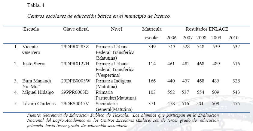 San Juan Ixtenco es una comunidad pequeña, pero cuenta con cuatro alternativas de educación primaria en cuanto a subsistema y horario. Las características de los centros escolares son relativamente distintas. La escuela particular Miguel Hidalgo se encuentra en el zócalo de la localidad y cuenta con mayor equipamiento, tiene la matrícula más pequeña lo cual permite una educación más personalizada y es la que tiene el mejor promedio de los resultados en la Evaluación Nacional del Logro Académico en Centros Escolares (ENLACE) (tabla 2). La escuela matutina Vicente Guerrero tiene la matrícula más poblada, se ubica en el segundo lugar en la misma evaluación y de las escuelas públicas es la que cuenta con mayor equipamiento y reconocimiento de la comunidad, figura como la primera opción de las familias y es la única que lleva un proceso de selección. La escuela vespertina matricula a los niños que no tuvieron acceso a la matutina y la Bimi Manandi Yu"Mu" matricula a los niños de menores ingresos y a los pertenecientes a la etnia.