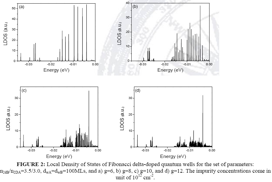 where α = 2/15π and z0 = (α3 / πnau2D)1/5 Here l and n2D represent the location and impurity concentration of the delta-doped quantum well. We use this expression to build our quasiregular system choosing appropriately the location (lA and lB) and impurity concentration (n2DA andn2DB) of the starting blocks A and B as well as subsequently applying the substitution rules of the Fibonacci sequence, g(A) = AB and g(B) = A. To calculate the electronic structure, we use the semi-empirical sp3s* tight-binding aproximation including spin together with the Surface Green Function Matching Method (SGFM) and the Transfer Matrix approach [Vogl, 1983, 365; Priester, 1988, 8519; García, 1992]. Within these approximations it is straightforward to calculate the electronic spectra through the Green function and its relation to the Density of States [García, 1992]. Finally, the confining potential of the Fibonacci delta-doped quantum wells is taking into account through the modification of the diagonal parameters of the tight-binding hamiltonian following Graf and Vogl [Graf, 1995, 4940] and the generalization proposed by Vlaev and Gaggero-Sager [Vlaev, 1998, 1142].
