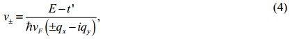 where t' is proportional to the bandgap of value 2t' (we choose t' = 0.10 eV for our numerical results), q is the two-dimensional wave vector associated with the SiC and hBN substrates termed as the q-region (Fig. 1), and "±" states electrons and holes, respectively. The corresponding wavefunctions taken the form,