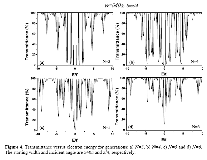 Fig. 4 represents self-similarity between generations, this is, transmission spectra are quite similar for different numbers of generation. Here, the transmission spectra correspond to w = 540a and θ=/4 for generations (a) N = 3, (b) N = 4, (c) N = 5 and (d) N = 6, respectively. We can notice that the transmission spectra present similar envelopings that nicely obey the well known scaling rules of the triadic Cantor set, see Fig. 6.