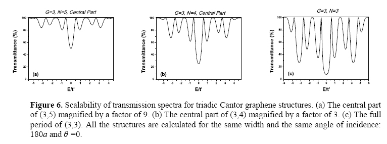 Finally, we studied the scalability of triadic Cantor multilayers. We have found that the spectrum of all Cantor structures show evident scalability. This is, the total spectrum of a (G, N2) structure appears as a part of a (G, N1) structure, where the scaling factor is: GN2-N with N1>N2. Thus, if we magnify the central part of a (G, N1) structure by the corresponding scaling factor we obtain that the resultant spectrum match up almost perfectly with the spectrum of (G, N2). Here G is the generator and N is the number of generation. Moreover, the period is equal to the total number of peaks that is equivalent to the number of layers (Lavrinenko 2002, 036621). As we can see from Fig. 6 Dirac electrons fulfill with these well known properties.
