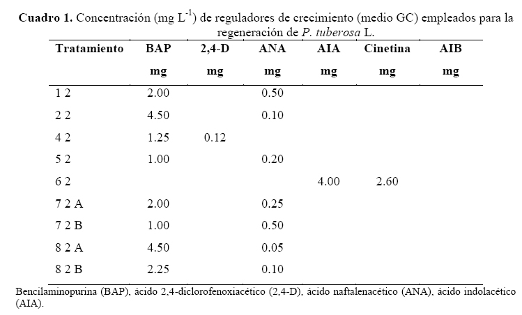 En esta investigación, el mayor porcentaje de brotes se observó en medios con contenidos relativamente altos de BAP y bajos de la auxina ANA. En un estudio que se ha realizado recientemente Naz et al. (2012), consideran que el regulador de crecimiento BAP es importante en la propagación y multiplicación masiva in vitro de P. tuberosa L, en este estudio el número de brotes producidos por explante fue mayor en medio que contiene 2,5 mg L-1 BAP en combinación con 0,5 mg L-1 de NAA y 0,1 mg L-1 de Kin (5 ± 0,42 brotes por explante).