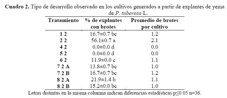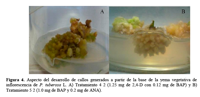 Con respecto al callo en explantes de yema se logro el mayor porcentaje (52.9) con el tratamiento 4 1 (BAP 1.25 mg y 2,4-D 0.12 mg L-1) resultados que cotrastan con Otsuji et al. (1994) quienes generaron cultivos de callo a partir de segmentos de tejido de tépalo, en cultivos en suspensión en un medio MS con 2,4-D, (2.61 y 2.25 mg) para la obtención de polisacáridos de nardo y con Sangavai y Chellapandi (2008) que lograron el desarrollo de callo en cultivos de tejido de cormo (37.8 %), en el medio MS que contenía BAP, 0.5 mg y AIA, 3.0 mg.