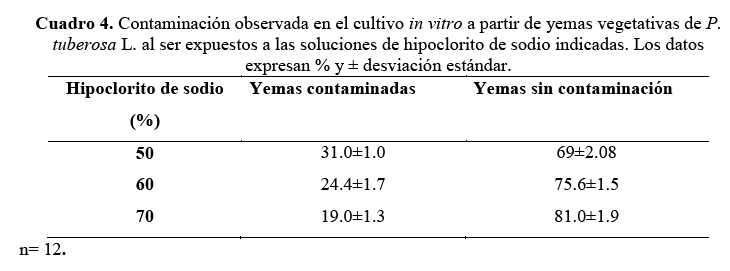 Con la finalidad de reducir el problema de contaminación, las yemas fueron expuestas a las soluciones de 50, 60 y 70 % v/v de hipoclorito de sodio, en el proceso de desinfección, el mayor porcentaje de cultivos contaminados se presentó en las yemas tratadas con la solución de 50 % hipoclorito y la menor contaminación en los cultivos de yemas tratadas con la solución de 70 % (Cuadro 4).