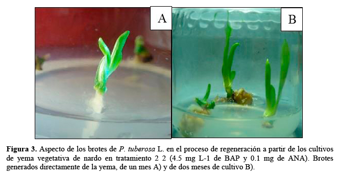 Esta investigación se llevó a cabo para generar plantas de nardo a partir de las yemas vegetativas de la vara floral y de tejido de cormo. La regeneración de plantas a partir de yemas de la inforescencia de la planta de nardo, con mayor respuesta en presencia de los reguladores de crecimiento BAP 4.5 mg y ANA 0.1 mg. En estas condiciones se han logrado regenerar un total de 139 brotes en seis tratamientos (1 2, 2 2, 7 2 A, 7 2 B, 8 2 A y 8 2 B) que contienen BAP y ANA, las cuales están en fase de aclimatación. Marulanda-Ángel et al. (2011) lograron regenerar brotes de Heliconia bihai (L) a partir de meristemos florales en el medio MS que contenía BAP (6 mg) y en un subcultivo posterior en presencia de 2 mg de BAP, y de 0.5 mg de AIA pero, la regeneración de brotes no se logró en medios que contenían concentraciones de BAP entre 0.5 y 4.5 mg, en cotraste con los resultados de esta investigación se logró la regeneración de brotes al adicionar BAP entre 1.0 y 4.5 mg.