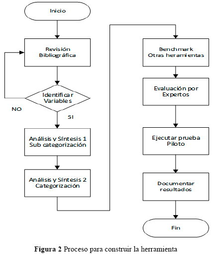 Para construir la herramienta se diseñó, planeó y ejecutó el siguiente proceso (ver la Figura 2 Proceso para construir la herramienta) el cual inicia con la revisión de la literatura con el propósito de identificar las variables clave o los determinantes del éxito comercial así como los métodos de valuación de la tecnología y las herramientas actualmente disponibles para realizar la evaluación en ETT.