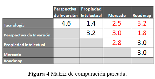 La comparación pareada de los pesos relativos para la evaluación deja entre ver que la inversión en etapa temprana es el criterio menos importante, es decir, que la relación entre la inversión necesaria y la probabilidad de éxito es una relación débil; por el otro lado, la relación entre la categoría del mercado y la probabilidad de éxito es una relación fuerte. En el mismo contexto, se identificó que en segundo grado, tanto la tecnología como su mapa de ruta, tienen la misma fuerza de relación con la probabilidad de éxito.
