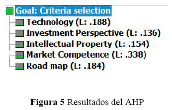Por otro lado, una de las preguntas de la investigación busca responder cuáles de las variables tienen mayor importancia por lo que se propuso responder a la pregunta mediante comparaciones pareadas solamente entre las cinco categorías con lo cual se pudo identificar la categoría de Mercado como la más significativa con un 33.8% seguida por la Tecnología (18.8%), el roadmap (18.4%), la Propiedad Intelectual (15.4%) y finalmente la Perspectiva de Inversión con 13.6% (ver Figura 5). Estos números se obtuvieron como resultado del ejercicio realizado a once expertos quienes, basados en su experiencia, compararon cada una de las categorías contra las cuatro restantes en una escala de1 1 al 9 y cuyos resultados en conjunto se procesaron a través del software expertchoice® (Choice, 2012) que utiliza un algoritmo de análisis jerárquico el cual es un método de descomposición de una situación compleja y sin estructura, en sus partes o variables, en un orden jerárquico; asignando valores numéricos a juicios subjetivos para determinar qué variables tienen la mayor prioridad y por lo tanto, actuar en consecuencia para influir en el resultado de la situación.