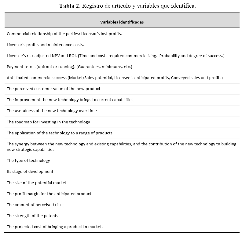 Se construyó una hoja de registro para cada artículo revisado que incluye: el título del artículo, el autor y las variables que identifica. La Tabla 2, muestra un ejemplo del artículo "Early Phase Technology Management Valuation Practices by University Licensing Offices in the United States: Empirical Data from a Survey of the Top 100 Organizations" de los autores Cory R. A. Hallam, Anita Leffel, e Ismael Chinea.