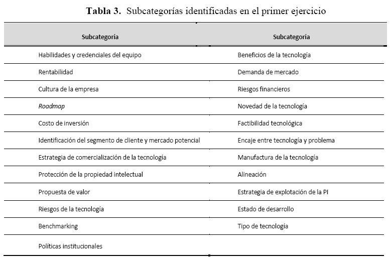 La elaboración de la herramienta de evaluación depende grandemente de la identificación de las variables relevantes, las cuales fueron 267 que fueron analizadas y re-agrupadas para su posterior evaluación a la pertinencia de la etapa temprana de la tecnología. En este estudio las 267 variables identificadas se agruparon en cinco categorías de criterios que se recomiendan evaluar, tanto los encontrados en la literatura como los que se identificaron de las herramientas que existen actualmente -Tecnología, Perspectiva de Inversión, Propiedad Intelectual, Mercado y Roadmap. El primer objetivo de la investigación fue el de identificar cuáles variables debían ser evaluadas y éstas se presentan en los cinco grupos sugeridos, haciendo un análisis comprehensivo de la tecnología.