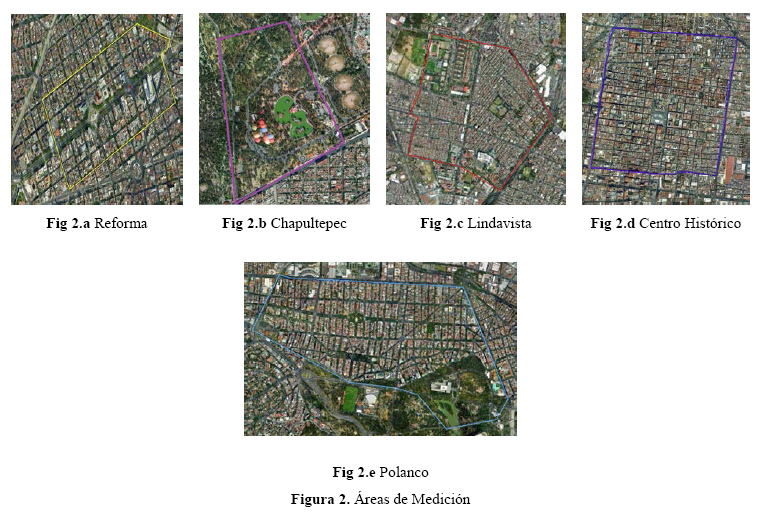 Las mediciones de campo fueron realizadas empleando un analizador de espectro capaz de trabajar en el rango de frecuencia de 9 kHz a 7.1 GHz [5-6]. El equipo es capaz de demodular la señal WCDMA permitiendo obtener información de diferentes factores de desempeño, en nuestro caso, la potencia del canal de CPICH. Se seleccionaron cinco zonas de medición, basándonos en sus características de entorno. En estas zonas se pueden encontrar diferentes tipos de terrenos: área abierta, área suburbana y área urbana, además de presentarse diversos tipos de construcciones. Las áreas de medición se muestran delimitadas en la Figura 2. Estas áreas de análisis, presentan una gran variedad de construcciones con características representativas dadas por su altura y materiales de construcción.