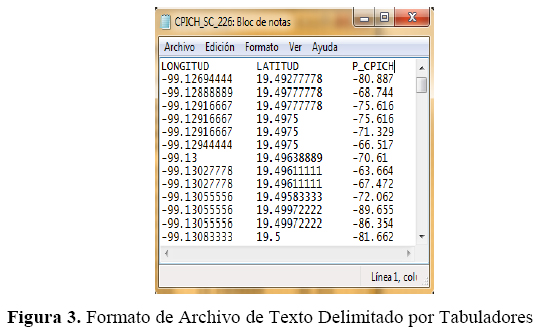 Para el procesamiento de la información se requiere disponer de información georeferenciada. El equipo de medición obtiene esta información al hacer uso de una antena GPS y genera información de posición como Latitud, Longitud, además de la potencia del canal piloto común. La Figura 3 muestra el formato del archivo de texto que ingresaremos en nuestro sistema. Como puede observarse, se requiere de la información georeferenciada en formato decimal, así como de la potencia en dBm.
