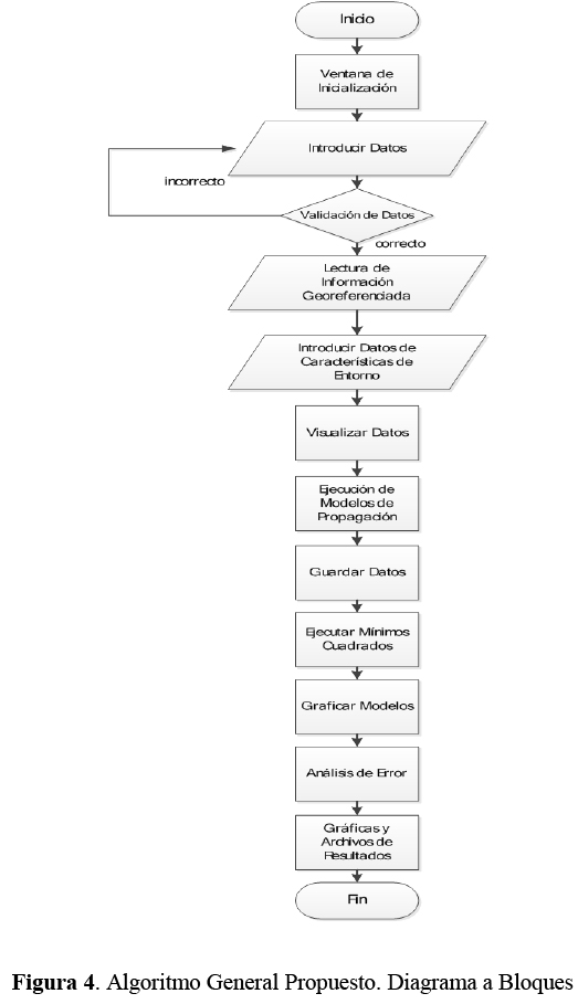 La Figura 4, muestra un diagrama a bloques donde se hace una descripción de las fases principales para el desarrollo de la herramienta de cómputo usada en este trabajo. Para cada uno de los modelos de propagación empleados, se seleccionan las variables de entrada correspondientes, en el caso del modelo de Okumura-Hata es necesario definir el tipo de área y el tipo de ciudad y finalmente ingresar la ubicación de la Estación Base o Nodo B.